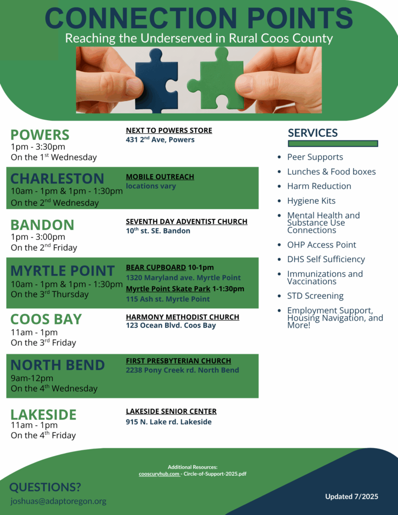 Providing services such as: Peer Supports, Lunches & Food Boxes, Harm Reduction, Hygiene Kits, Mental Health and Substance Use Connections, OHP Access Point, DHS Self Sufficiency, Immunizations and Vaccinations, STD Screening, Employment Support, Housing Navigation, and More!