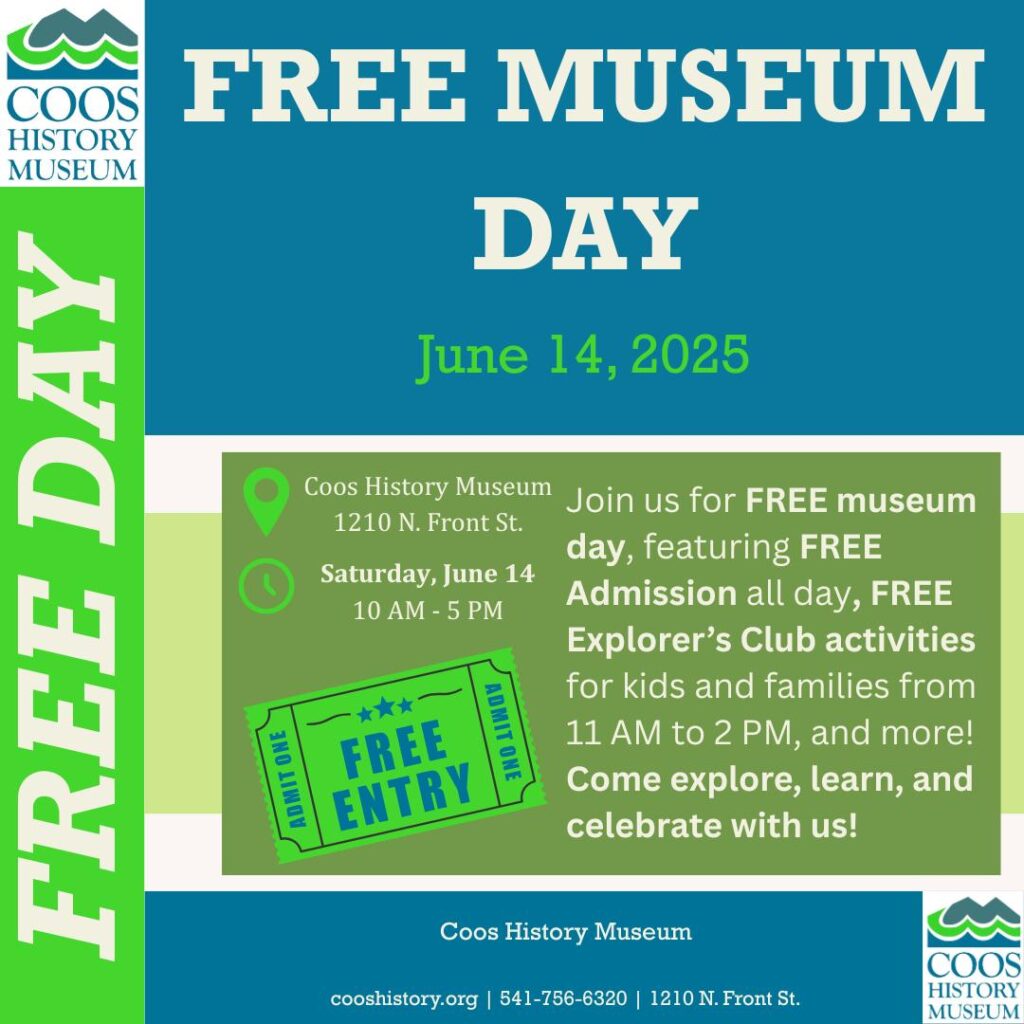 Coos History Museum is open for FREE from 10 am – 5 pm, plus FREE activities for kids and families from 11 am – 2 pm, June 14th, 2025.