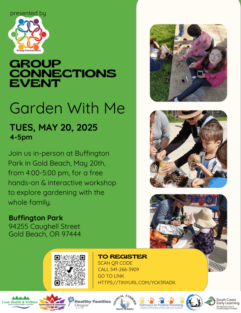 Join us May 20th, from 4:00-5:00pm, in-person at Buffington Park, located at 94255 Caughell Street in Gold Beach for a free hands-on & interactive workshop to explore gardening with the whole family!