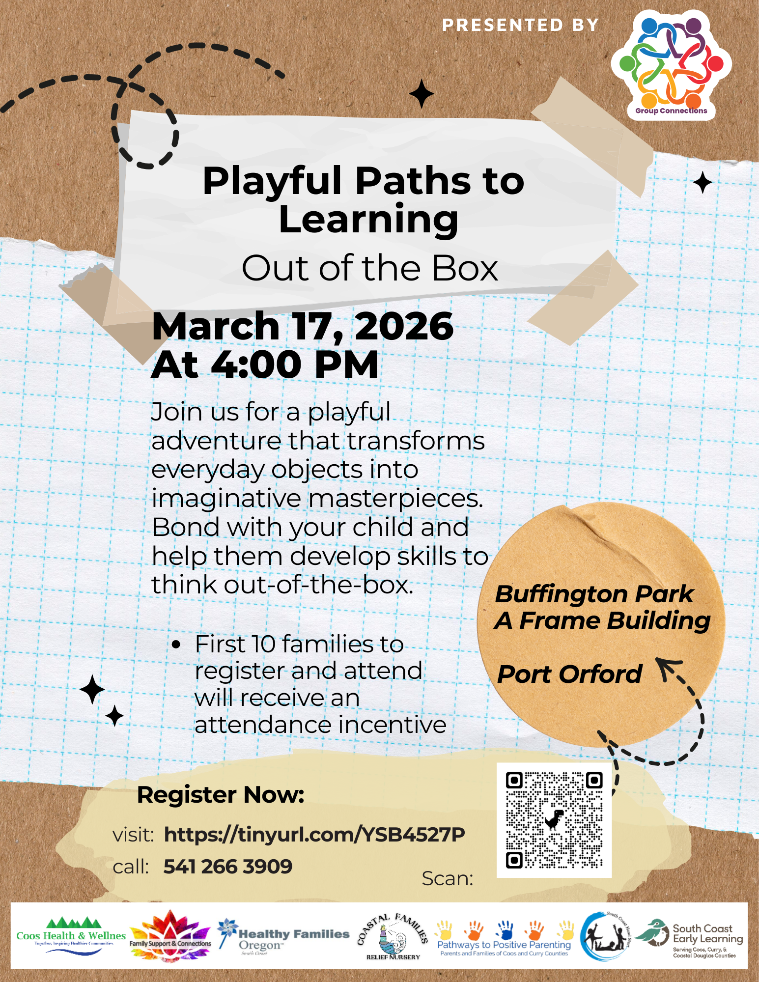 Join us in-person at the Buffington Park A Frame in Port Orford, March 17th, from 4:00-5:00pm, for a playful adventure that transforms everyday objects into imaginative masterpieces. Bond with your child while supporting their skills they need to be out-of-the-box thinkers.