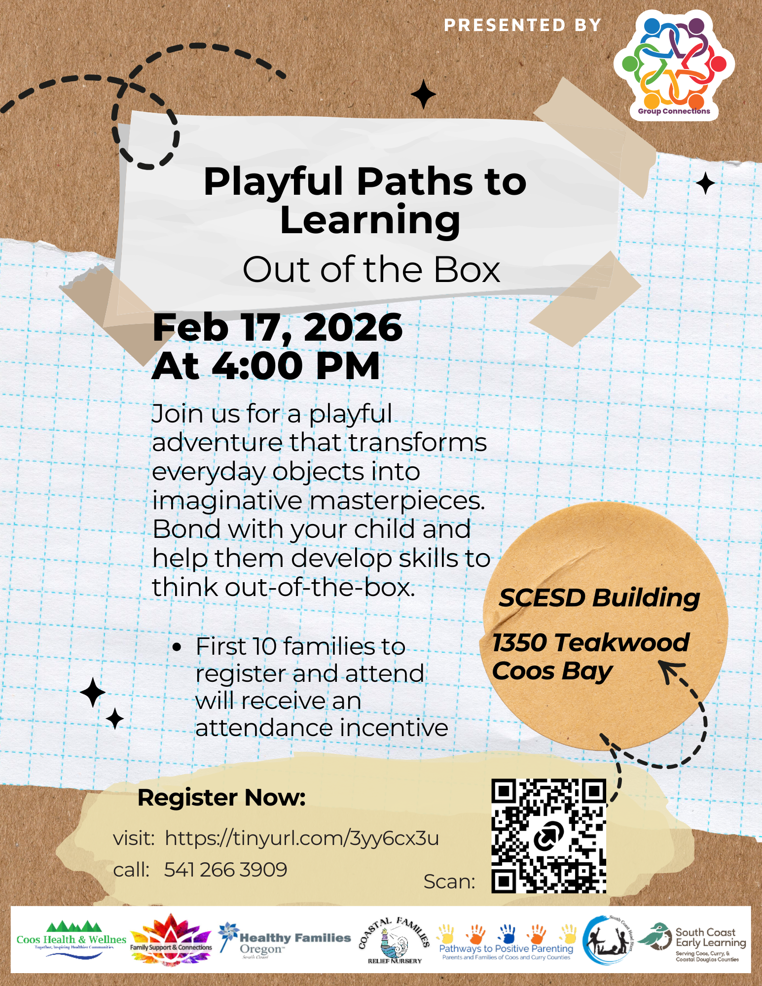 Join us in-person at the South Coast ESD in Coos Bay, February 17th, from 4:00-5:00pm, for a playful adventure that transforms everyday objects into imaginative masterpieces. Bond with your child while supporting their skills they need to be out-of-the-box thinkers.