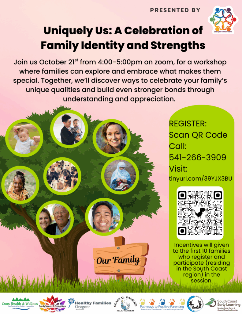 Join us October 21st from 4:00-5:00pm on zoom, for a workshop where families can explore and embrace what makes them special. Together, we’ll discover ways to celebrate your family’s unique qualities and build even stronger bonds through understanding and appreciation.
