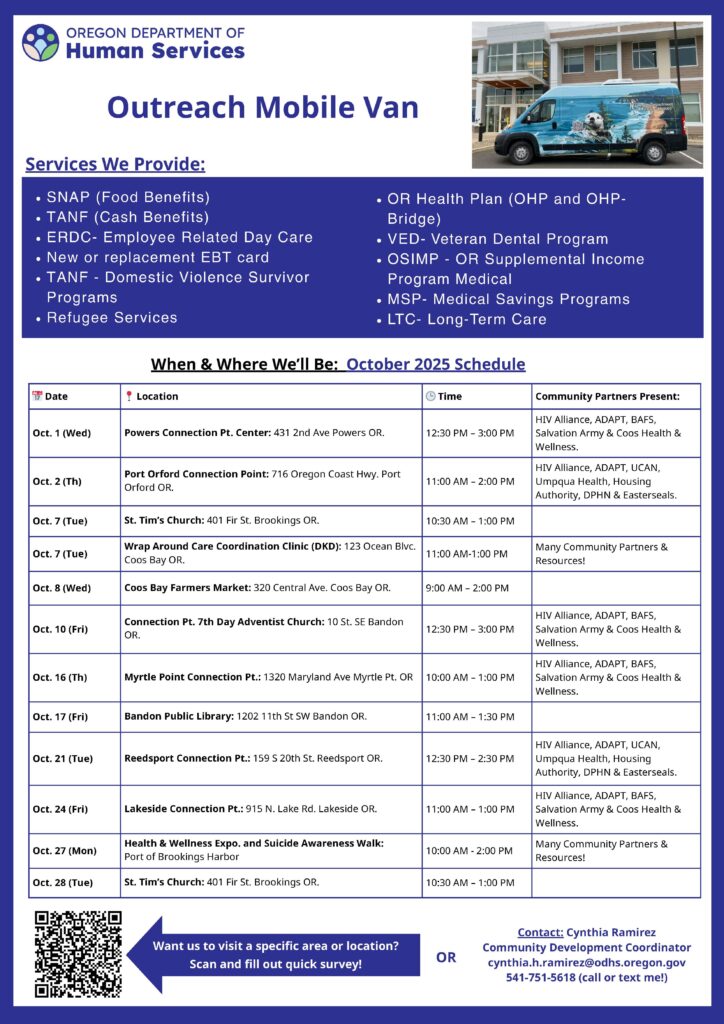 Our South Coast Mobile Van (Otto)’s October 2025 schedule is here! We use our mobile vans to meet people where they’re at and to reduce the stress that sometimes comes with going into an ODHS office.